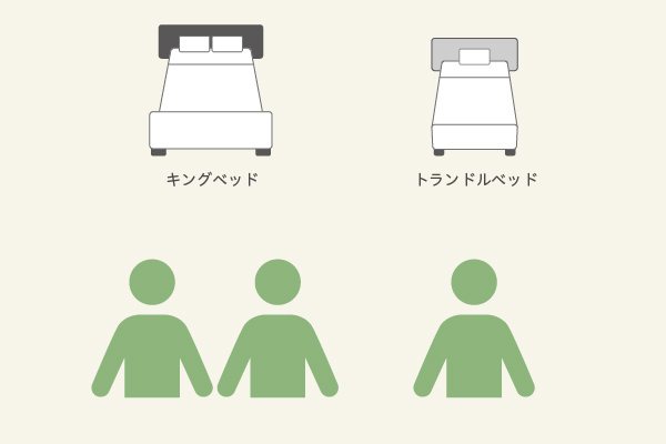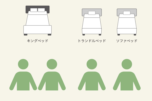 | ベッドサイズ(cm) | キングベッド:200 × 200 トランドルベッド:95 × 195 ソファベッド:95 × 195 |