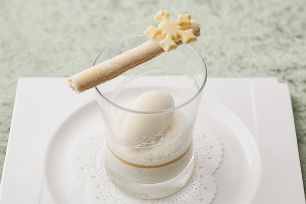 ホワイトチョコレートのパンナコッタに、キャラメル、ココナッツクリームなどを層に重ねたデザート。 柚子が爽やかに香る、ふわふわとした雪のようなくちどけをお楽しみください。