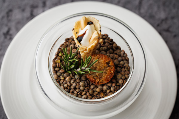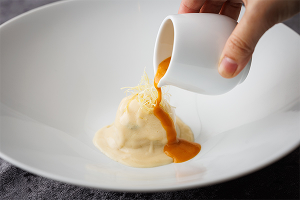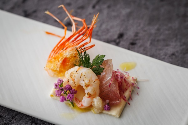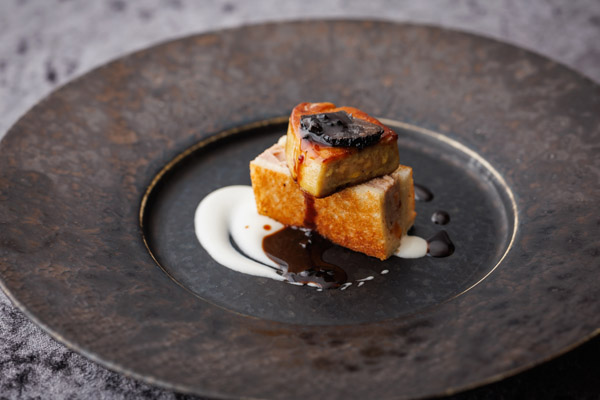 九絵とキャビアの始まりの一皿に続き、鮑、蟹、生雲丹の彩り豊かな冷前菜、フォワグラ、トリュフなどの豪華食材を使用した前菜へと続きます。
