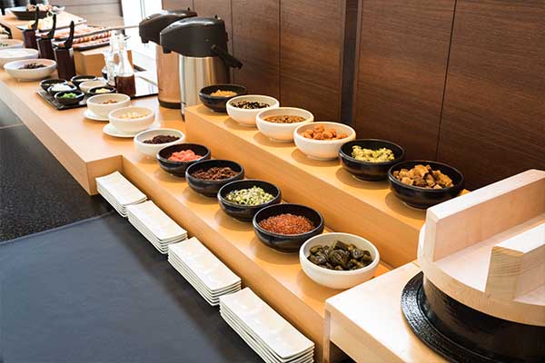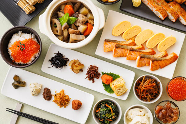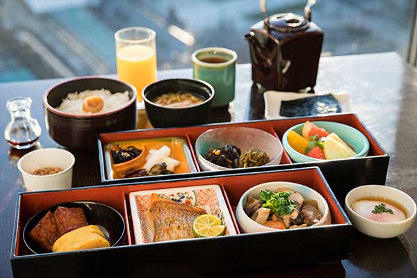 刺身、焼き魚、煮物、卵料理、納豆、海苔、ご飯(お茶漬け用和風出汁付き)またはお粥、味噌汁、香の物、フルーツ、ほうじ茶、オレンジジュース
