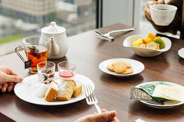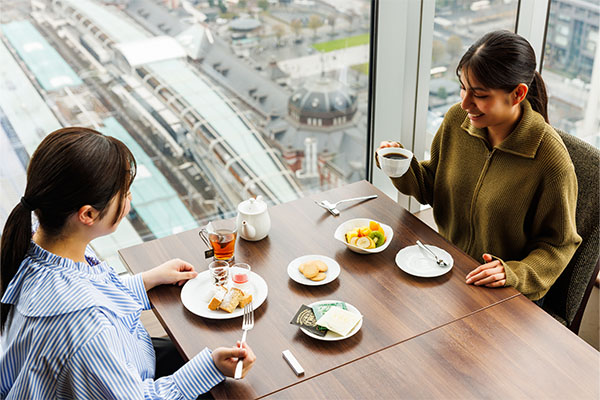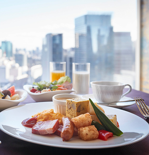 80品目を揃えたTENQOOならではの和洋ビュッフェ。東京駅上空に浮かぶ開放的な空間で、ご自身でのチョイスやアレンジが楽しめます。ソースやドレッシングなどは手作り感あふれるオリジナルの味を提供しており、食材については日本の中心である東京だからこそ、日本が誇る優れた食材を季節に応じて全国から取り寄せます。地上120メートルからの朝の清々しい眺めをお楽しみいただくとともに、お過ごしいただく朝が豊かな時間となるよう、心を込めて準備いたします。