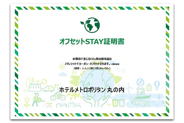 宿泊客1 名あたりの CO2排出量は約15kg(環境省排出源単位データベースより算出)とされています。この取り組みは、株式会社JTB コミュニケーションデザイン(本社:東京都港区)が提供する環境配慮型宿泊サービス「CO2ゼロ STAY」を通じ、その排出相当分を、CO2 削減活動(再生可能エネルギーの拡大や日本全国の森林保全活動など)に投資することで、宿泊で排出される温室効果ガスを埋め合わせるものです。ご希望のお客さまにはオフセット証明書も発行いたします。